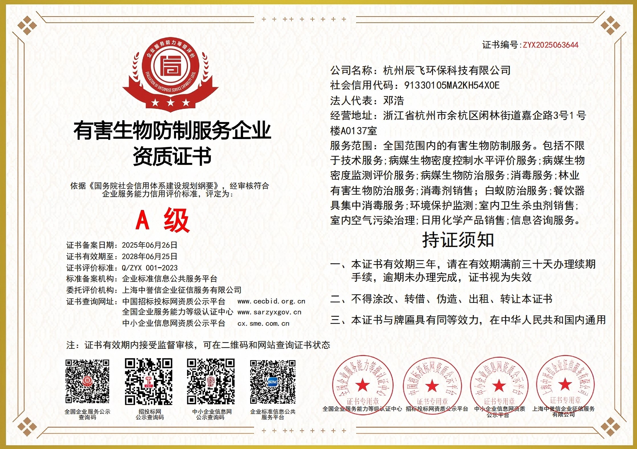 杭州辰飛環(huán)保科技有限公司是一家專業(yè)的PCO有害生物防治服務(wù)機構(gòu)。是經(jīng)杭州市工商局注冊登記、杭州市白蟻防治管理所、PCO協(xié)會批準(zhǔn)的城市害蟲綜合治理消殺公司,是集除四害、白蟻消殺、除蟲、消毒殺菌、室內(nèi)空氣污染治理、藥械銷售于一體的大型專業(yè)杭州有害生物防治科技有限公司。主要從事新建、擴建、改建、裝飾裝修單位建筑物的白蟻防治和白蟻預(yù)防工程,同時從事工廠、酒店、企事業(yè)單位、住宅小區(qū)和家庭的”四害”消殺和白蟻防治服務(wù),長期向各類型客戶提供杭州白蟻消殺、除蟑螂、除老鼠、除蟲、消毒殺菌等優(yōu)質(zhì)服務(wù)。 本公司自成立以來,秉承“誠信、敬業(yè)、高效、務(wù)實”的發(fā)展原則,以現(xiàn)...